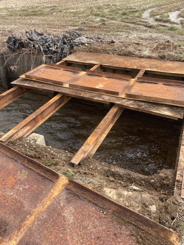 機械を圃場に乗り入れる鉄板を直してます